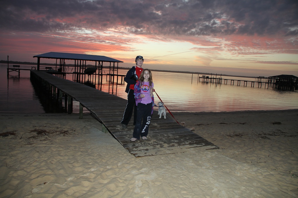 The alarm clock sounded, as I stretched and cracked my back, as is my usual routine. Rebecca had set the alarm. Last night she was determined to see those dolphins, as an early birthday present. She'd been very particular about her birthday, that she wanted to be somewhere cool. Before the trip and in the early months we had thought we were going to keep our R.V. in storage and fly home, and then do her birthday in California, where we'd keep it in storage. Well that didn't happen, and I'm glad it didn't, because we got a lot of time to clean it out and start over, and catch some Midwest states on our way back. But Rebecca also didn't want her birthday to be a moving day, where we moved somewhere, staying valuable hours in an R.V. where you get a headache and have stress, and things fall around and shake all the time. She wanted also to play on the beach and make a sandcastle. A lot of wishes. So, on the 17th of January, we decided to leave for Gulf Shores, AL, at an R.V. park called Luxury R.V. Park. It WOULD prove to be nice. But back to the present information you've been given. It was dark, at the crack of dawn, and Rebecca told everyone to get up and dress, after we took the dogs out. And I got my video camera ready, the first time I'd used it on the trip, and also some binoculars also. Mom and Dad were going at a leisurely pace, taking their time.